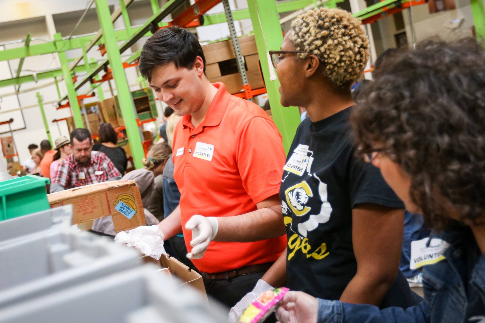 Stephen Green and Anthresia McWashington work together volunteering at the Houston Food Bank as part of Houston Community Newspaper's volunteer day.